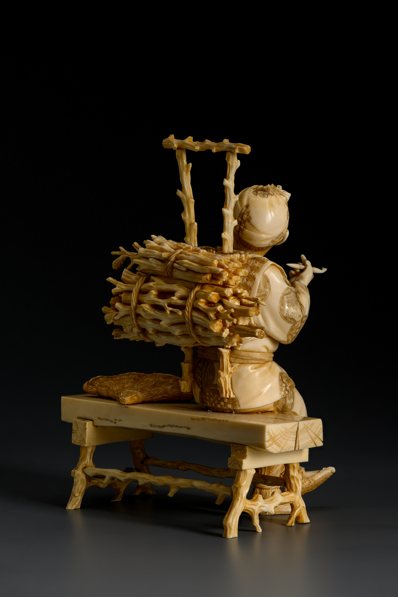 Произведение изображает пожилого мужчину, сидящего на лавочке. За его плечами – традиционное японское приспособление сёико для переноски каких-либо предметов, которые к ней приматывали веревками. К сёико аккуратно прикреплены сучья ровной длины, из чего мы можем сделать вывод, что перед нами – крестьянин-дровосек. Старик одет в кимоно и простую накидку без рукавов, на поясе которой подвязан сагэтабакоирэ – набор для курения. Такой набор состоял из кисета, трубки и чехла для нее. В одной руке у дровосека курительная трубка, другой он придерживает корзину с крупными плодами хурмы. На ногах дровосека сандалии варадзи, его голени защищает соломенная защита, стянутая веревками. Голова подвязана полотенцем тэнугуи, рядом на лавочке лежит соломенная шляпа.