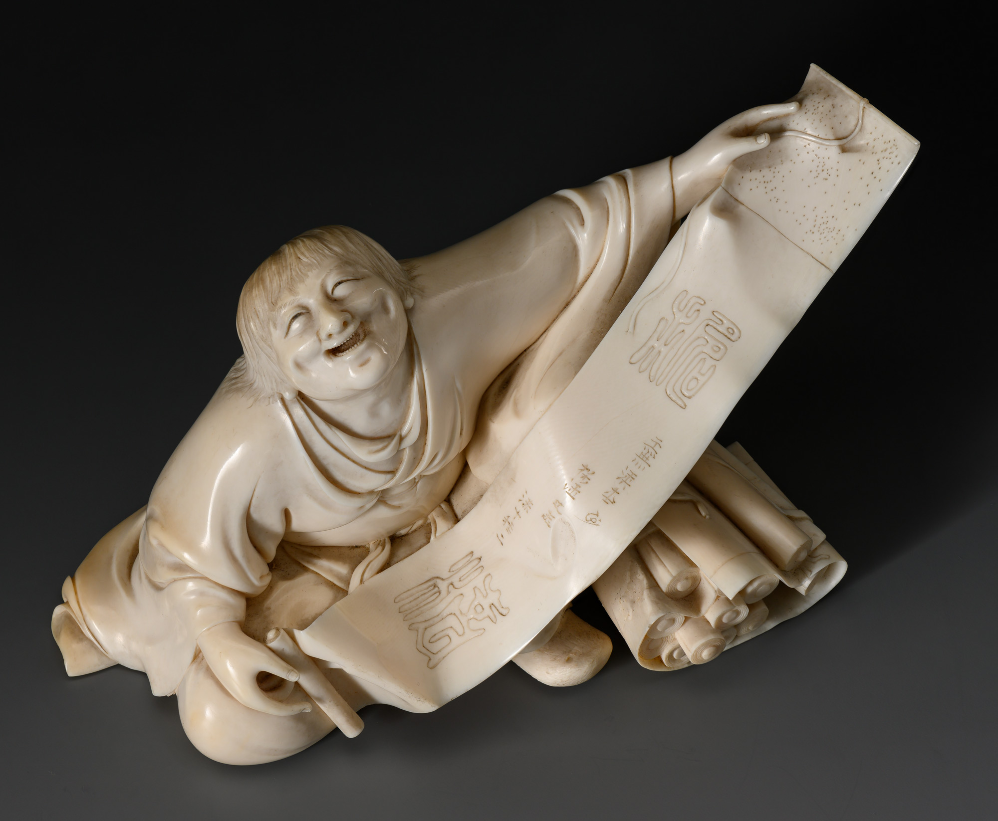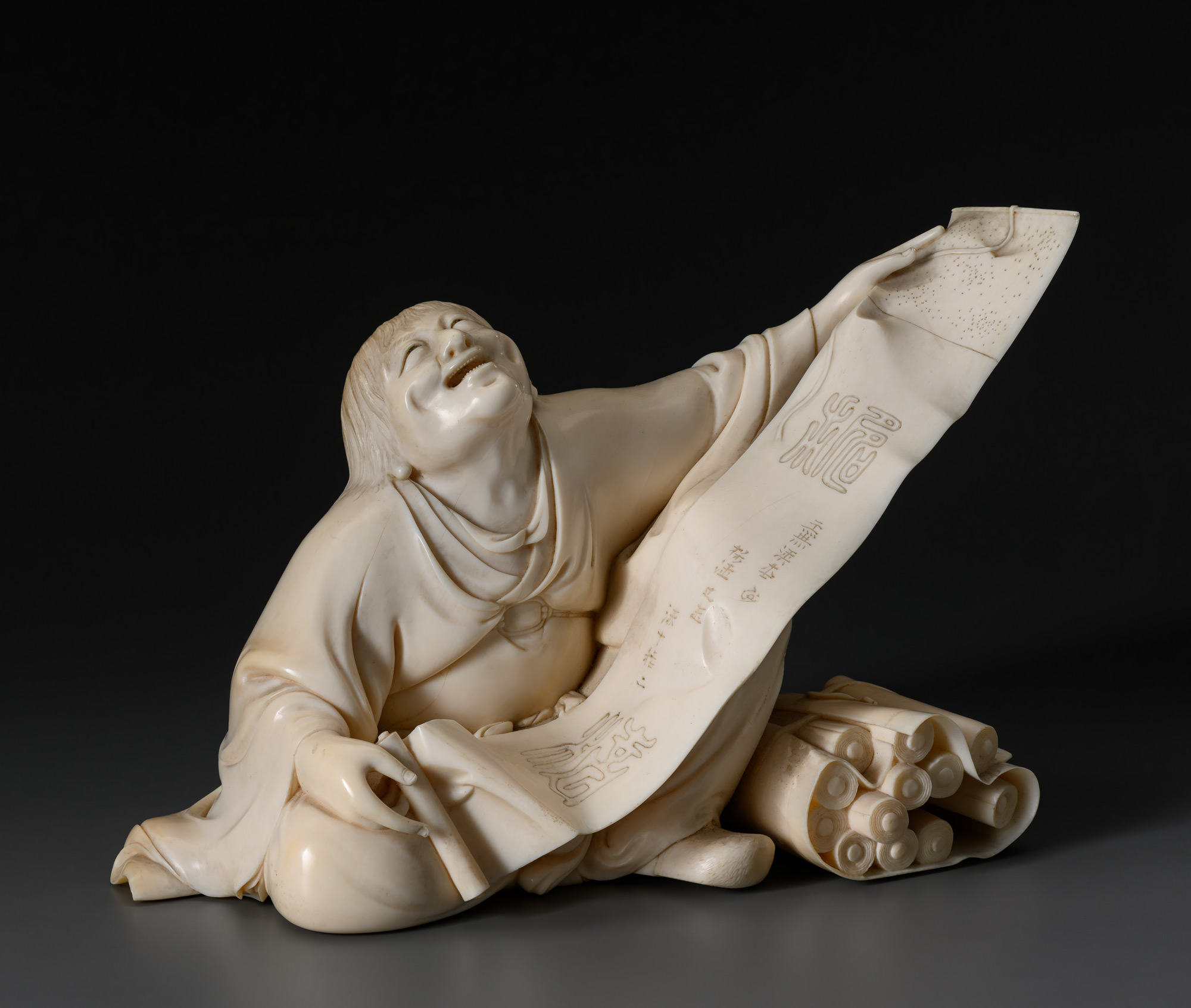 Произведение демонстрирует высокое мастерство декоративной работы по слоновой кости. Резчиком уделено большое вниманием к деталям и настолько проработаны все мельчайшие элементы произведения, что можно даже разглядеть иероглифы стихотворения на свитке поэта.