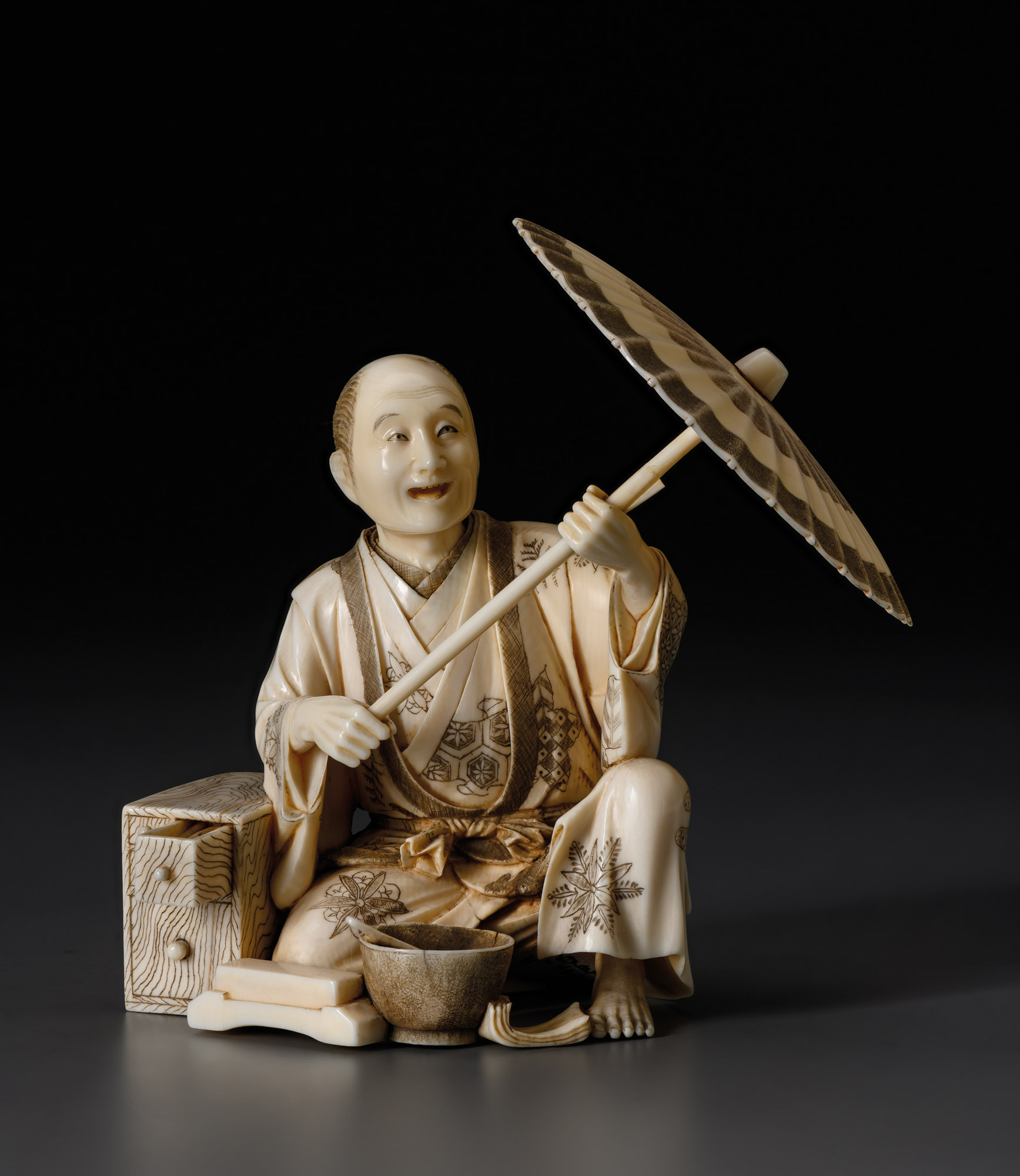Миниатюрное окимоно изображает касахари — мастера, создающего бумажные зонтики вакаса из бамбука и окрашенной японской бумаги васи. Мужчина аккуратно прикладывает к ручке листы бумаги. У ног мастера стоит чаша с разведенным клеем, в которой виднеется плоская кисть. Создание традиционных японских зонтов включает более ста процедур, которые делятся на несколько основных этапов: изготовление бамбукового каркаса; создание механизма для открытия и закрытия зонта; крепление бумажного купола и отделка. Готовую конструкцию покрывали маслом, чтобы капли дождя отскакивали от поверхности зонта.