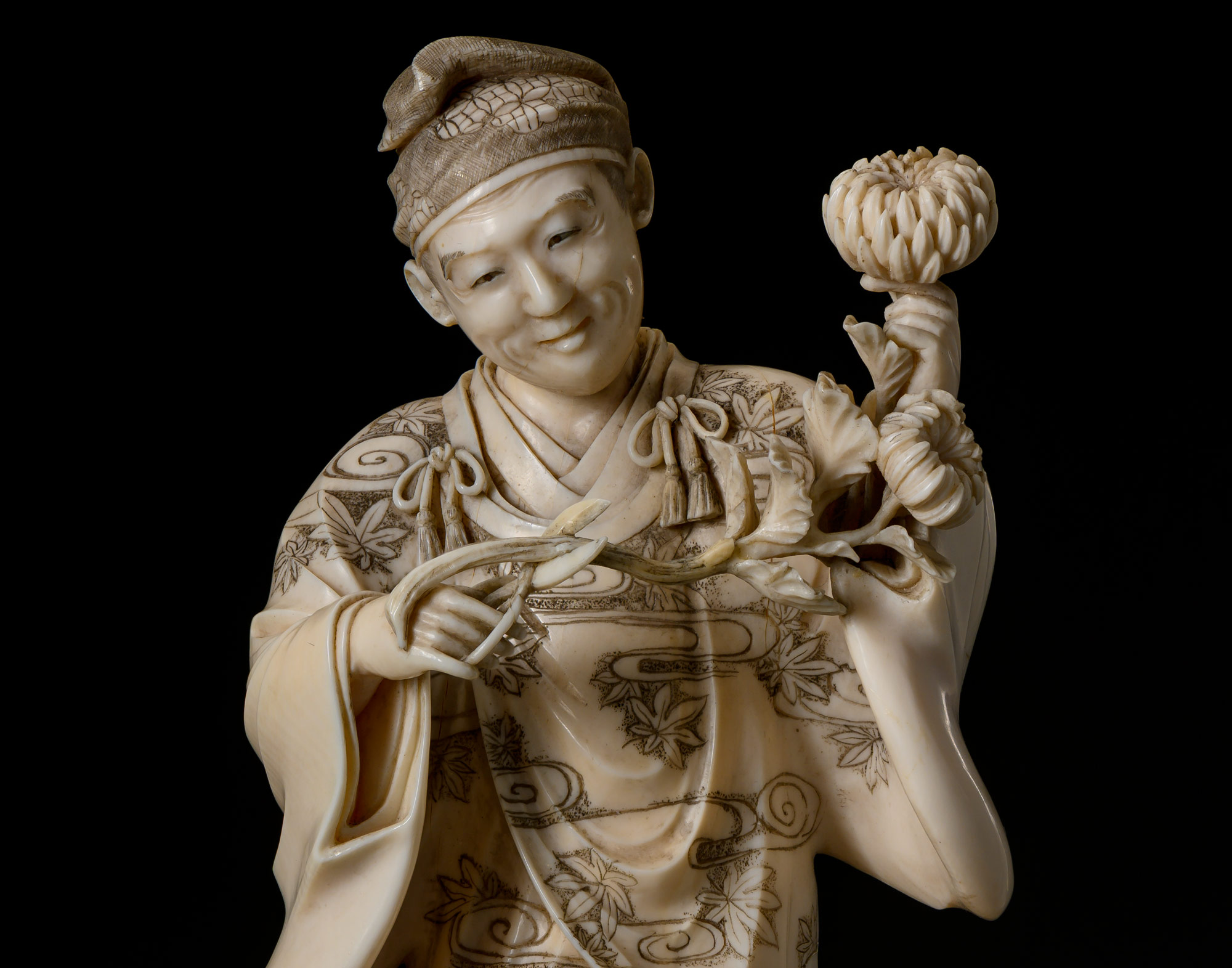 Окимоно изображает мужчину и мальчика с цветами хризантемы. В одной руке мужчина держит ветку с несколькими пышными бутонами. В другой руке у него специальные ножницы хасами, предназначенные для обрезки цветов. Мужчина составляет композицию икэбана и собирается обрезать цветок до нужной ему длины. Икэбана (яп. досл. «живые цветы») — традиционное японское искусство компоновки цветов. Первоначально оно имело религиозную направленность: композиции из цветов выступали в роли подношений богам в японских храмах. Впоследствии икэбана оформилось в самостоятельное искусство.
