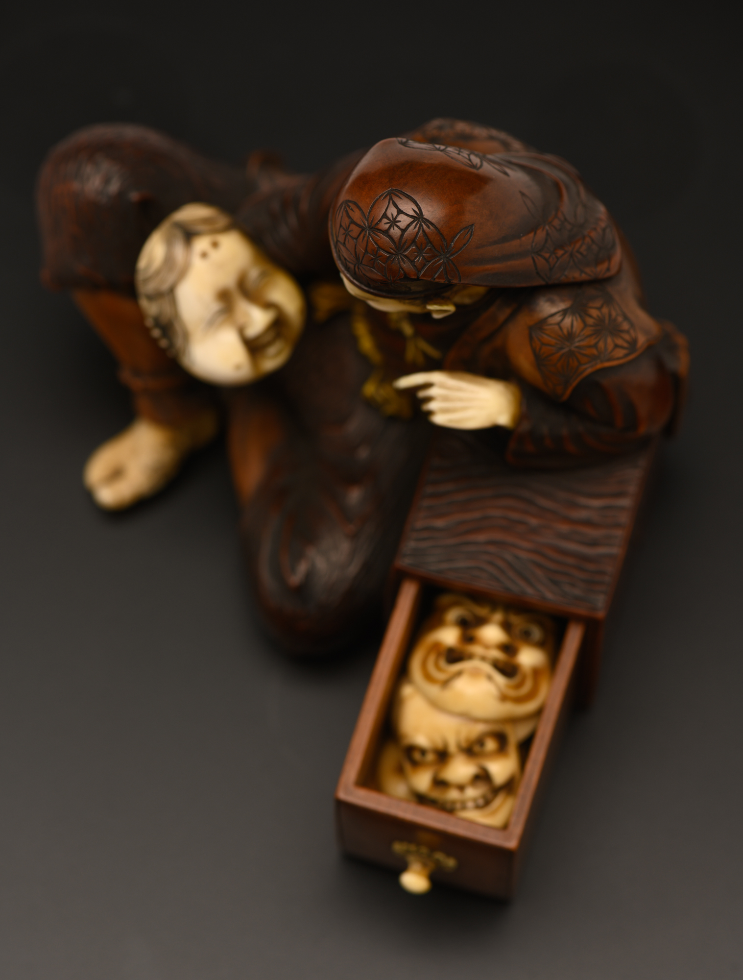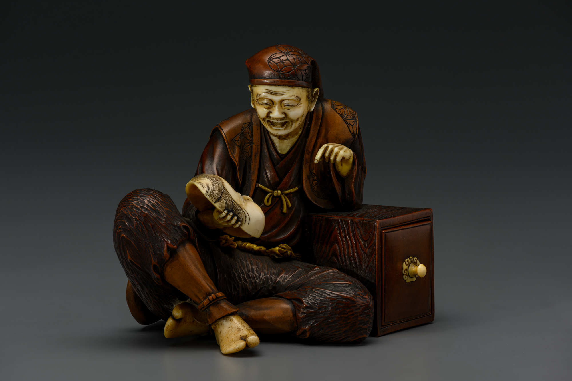 Окимоно изображает продавца масок. Произведение выполнено из дерева с элементами (лицо, руки, ступни и маски) из слоновой кости. Мужчина одет в короткое кимоно, штаны момохики и накидку хаори без рукавов, его голова повязана полотенцем тэнугуи. Продавец сидит, скрестив ноги, одним локтем он опирается на небольшой ящик, в котором находятся пять различных масок. Еще одну мужчина держит в правой руке: развернув маску лицом к себе, он словно ведет с ней беседу.