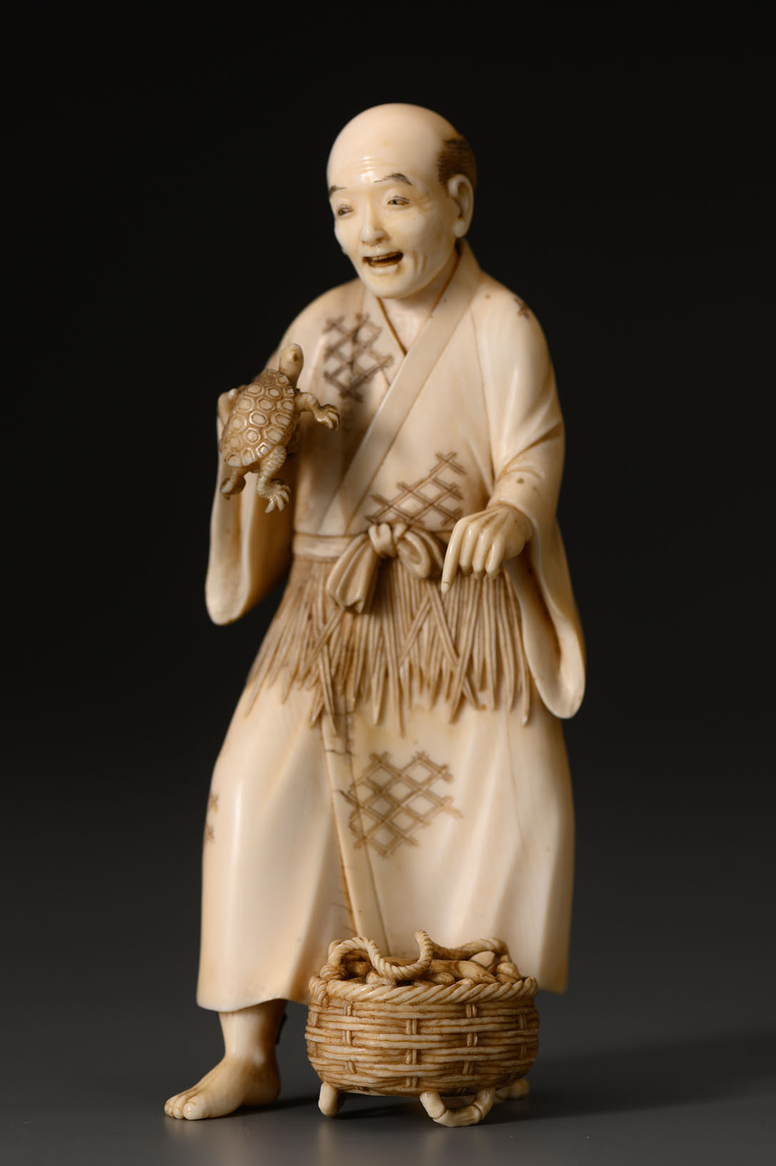 Окимоно изображает продавца рыбы. Он стоит в полный рост, в одной руке держит морскую черепашку умигамэ, второй указывает на плетеную корзинку, стоящую у его ног, полную моллюсков асари и рыбы. Сверху длинного кимоно, украшенного узором готэндзё (орнамент, изображающий наборные потолки в святилищах) надета соломенная юбка рыбака косимино.