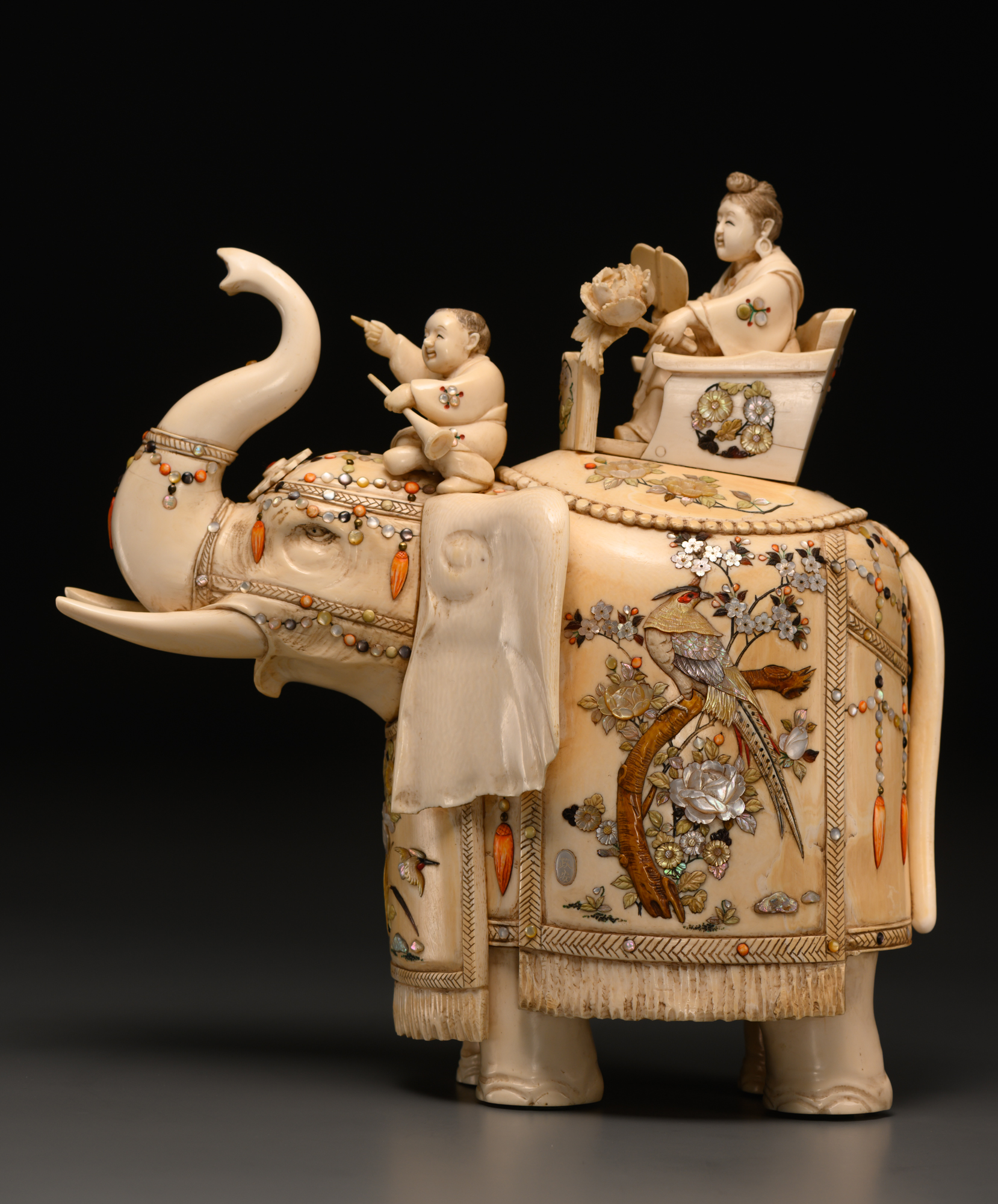 Окимоно изображает слона с высоко поднятым хоботом. Животное богато украшено сбруей с кистями и тканями, на которых инкрустацией изображены картины на сюжет «цветы и птицы». На спине слона установлен паланкин, в котором сидит бодхисаттва с высокой прической, с веером и большим цветком пиона в руках. На шее слона сидит маленький мальчик карако («китайчонок») с горном в левой руке; правой рукой он указывает направление движения. На Дальнем Востоке, в частности в Японии, образ мальчика-китайчонка карако был символом семейного счастья и пожеланием благородных сыновей. Бодхисаттва (яп. босацу; букв. «существо, стремящееся к пробуждению») — в буддизме существо, которое приняло решение стать буддой для блага всех существ. Побуждением к такому решению считают стремление спасти всех живых существ от страданий и выйти из бесконечности перерождений — сансары.