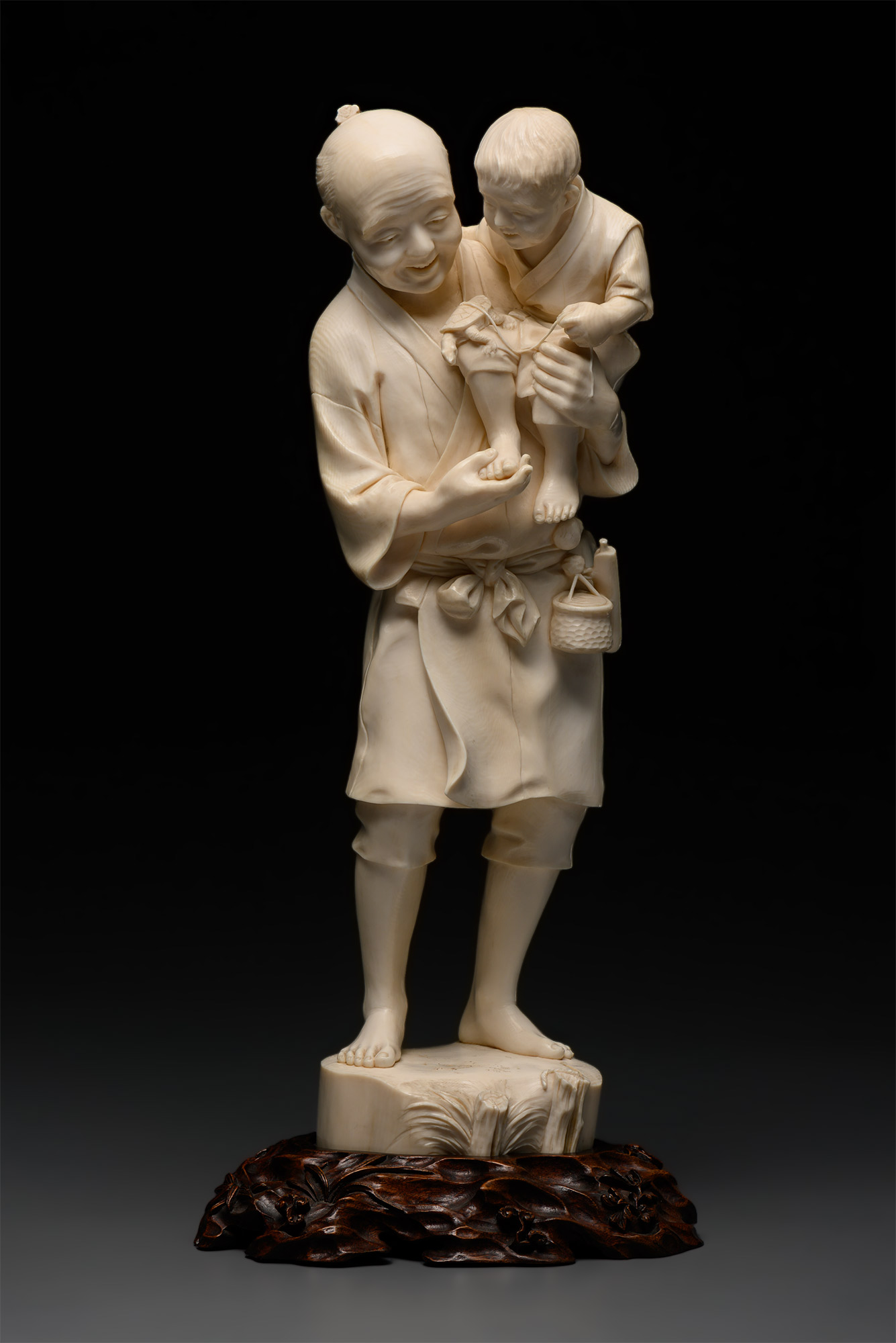 Окимоно изображает пожилого мужчину, который держит на руках маленького мальчика. Они с любопытством рассматривают маленькую черепашку на веревочке, сидящую на колене у мальчика. Оба одеты в простую одежду — укороченные узкие штаны момохики и короткие кимоно. К поясу мужчины подвязан набор для курения сагэтабакоирэ, состоящий из кисета и трубки в чехле. Табак был завезен в Японию из Европы еще в XVI веке, и вскоре набор из кисета для табака и трубки для курения сагэтабакоирэ стал одной из самых востребованных вещей среди мужчин.