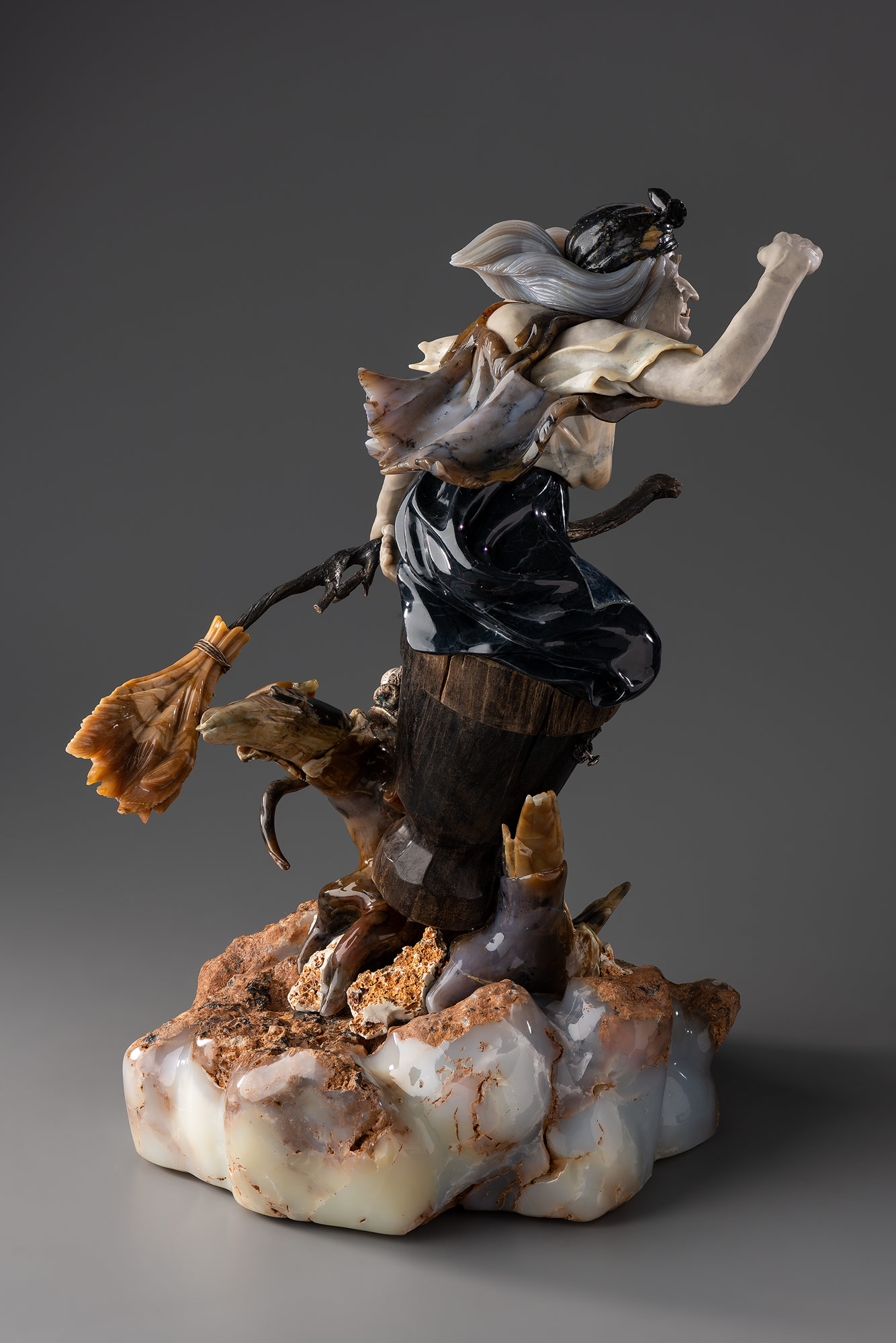 Скульптура вышла живой и динамичной. Ступа Яги выполнена из окаменелого дерева. На высоком художественном уровне проработаны мельчайшие детали сказочной героини: голову прикрывает антрацитовый платок, выполненный из агата, седые волосы, хаотично выбивающиеся из‑под него, развеваются в такт встречному ветру.