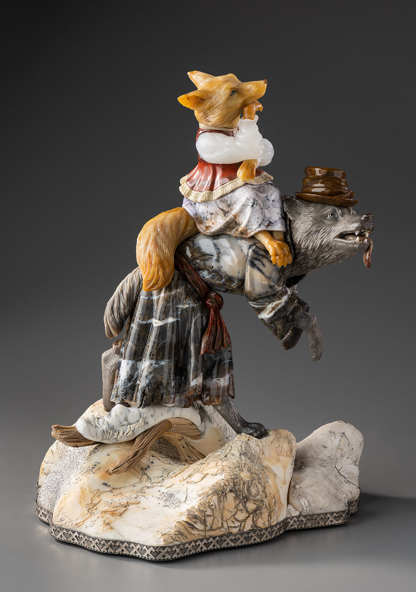 На подставке с серо-белыми низкими сугробами и выступающими коричневыми корнями — фигура идущего на задних лапах серого волка в подпоясанном красно-коричневым кушаком пестром армяке бело-серо-коричневых тонов и коричневой шапке. На спине волка сидит рыжая лисица в белой кофте, пестрой бело-коричневой юбке и красно-коричневой душегрее с меховой опушкой. Она подпирает длинный нос правой передней лапой.