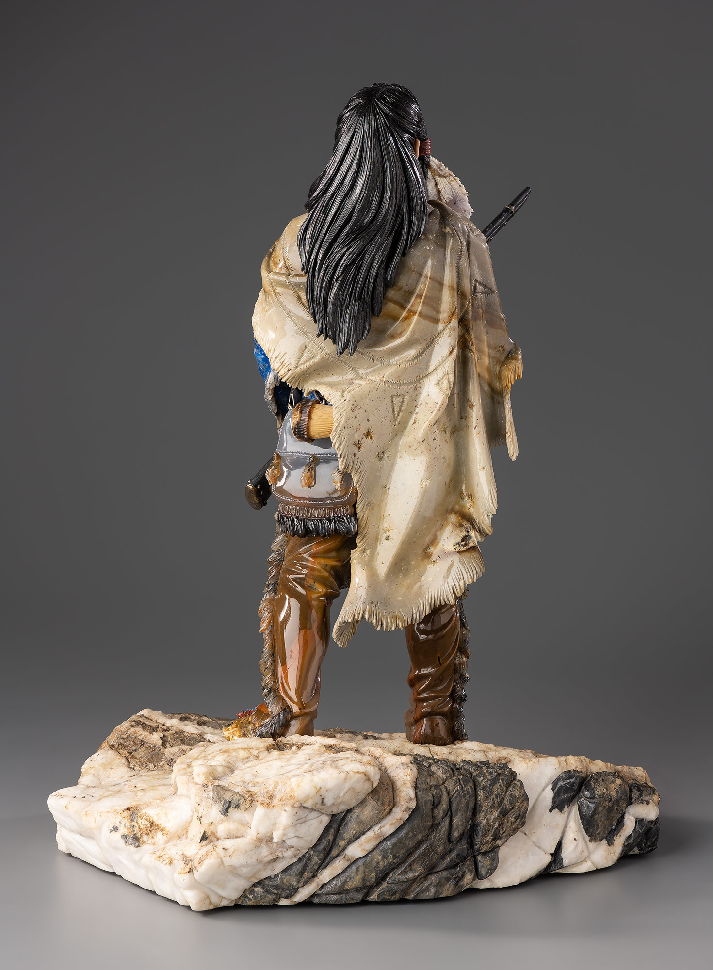 Грамотный подбор и искусная обработка цветного камня создают реалистичную фигуру в яркой этнической одежде. С особой тщательностью проработаны складки накидки и вибрирующая бахрома. Верхняя рубаха индейца выполнена из лазурита. Каждая деталь костюма, будь то тесьма, орнамент ремня, перекинутого через плечо, зигзагообразный узор на переднике, дугообразная застежка, скрепляющая наброшенную на плечи накидку, демонстрируют не только мастерство и умение работать с материалом, но и художественное видение колористического единства, когда каждый камень добавляет нужный штрих, как краска в палитре живописца.