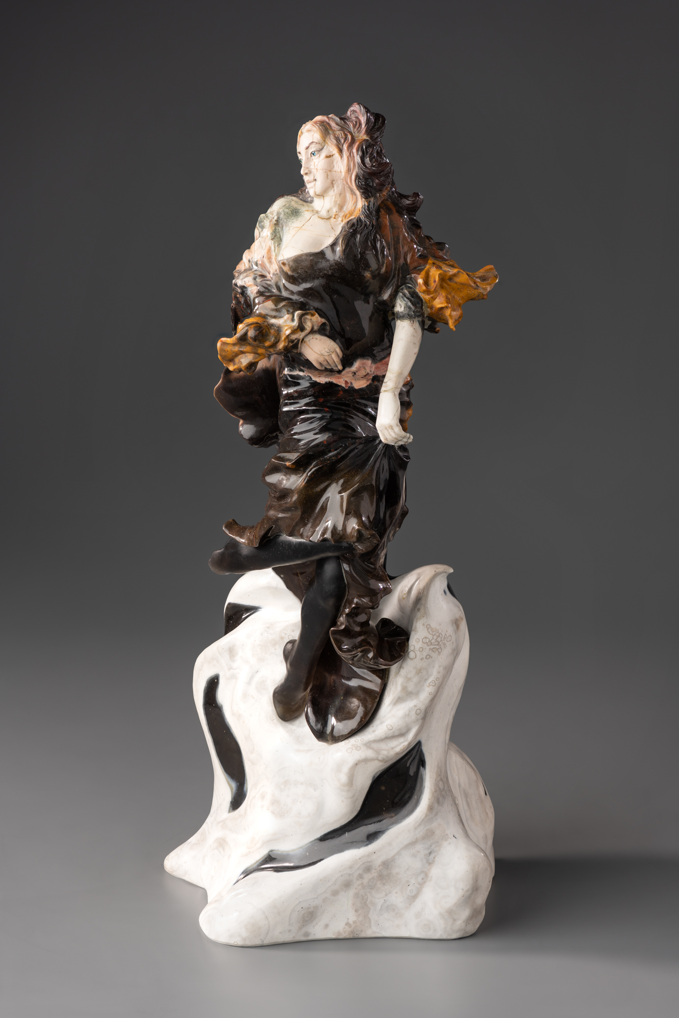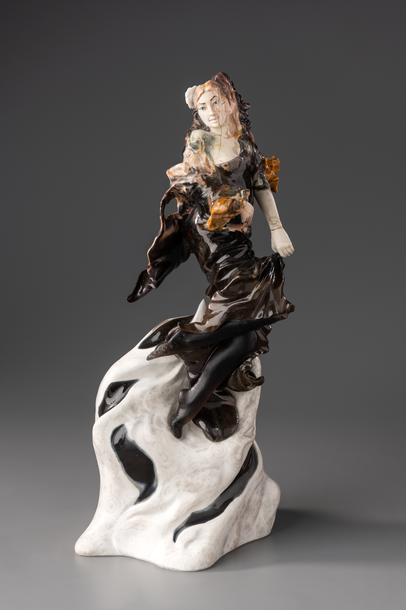 В изысканной настольной скульптуре екатеринбургских мастеров Ивана Голубева и Алексея Зефирова “Кармен” мастерски передан дух героини одноименной новеллы П. Мериме и оперы Ж. Бизе. Образ Кармен был создан почти 150 лет назад, но и по сей день он будоражит умы писателей, режиссеров, художников и скульпторов по всему миру. Танцующая фигура, выполненная на высоком постаменте из обсидиана с серыми и черными прожилками, создает ощущение движения и вихря вокруг себя. Кармен изображена в традиционном для фламенко платье - bata de cola, элегантно подчеркивающим ее силуэт. Левой рукой она приподнимает подол, изящно демонстрируя ножки, что усиливает ее привлекательность, грациозность и независимость.