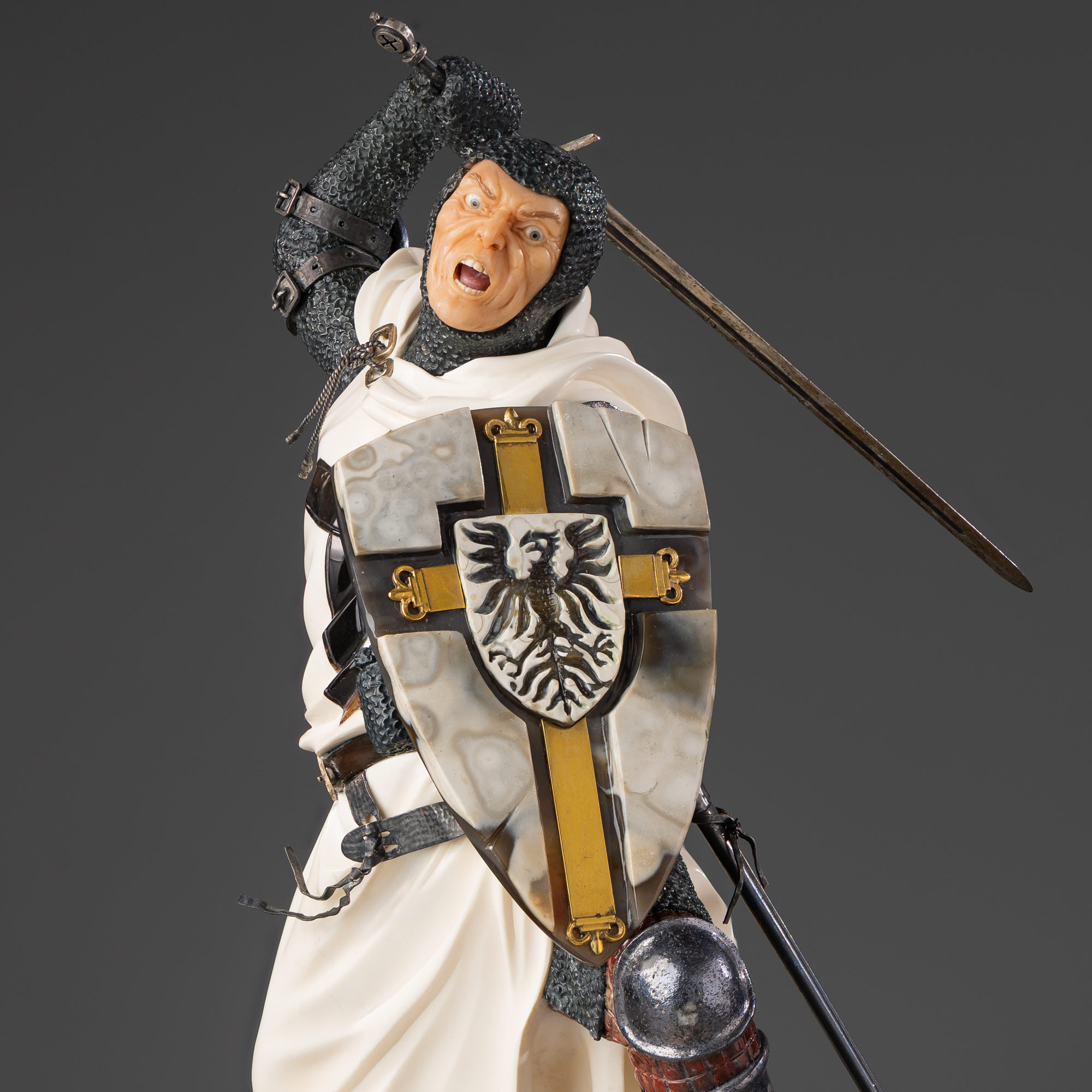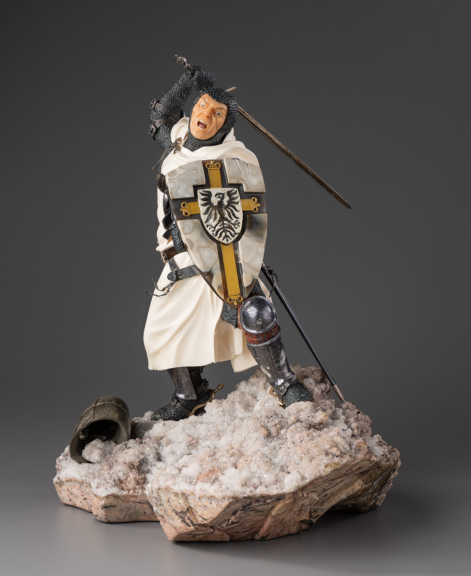 Скульптура из серии «Воины мира» уральской студии «Святогор» изображает европейского рыцаря из отрядов Тевтонского ордена, вероятно монаха одного из католических западноевропейских государств (Франции, Германии, Италии, Англии), участника одного из многочисленных религиозных «крестовых походов», которые инициировала в XI–XV веках Латинская церковь для освобождения христианских территорий «Святой Земли» (Сирии и Палестины) от турков-мусульман, язычников и еретиков. Герой одет в облегающую кольчугу из вырезанного мелкой ячейкой темно-серого камня, динамичные складки белого плаща с черным крестом передают остроту момента. В руках крестоносца обоюдоострый металлический меч и щит из белых пластин с эмблемой орла. Крупные зарубки на верхнем крае деревянного щита свидетельствуют об успешно отбитых атаках противника.