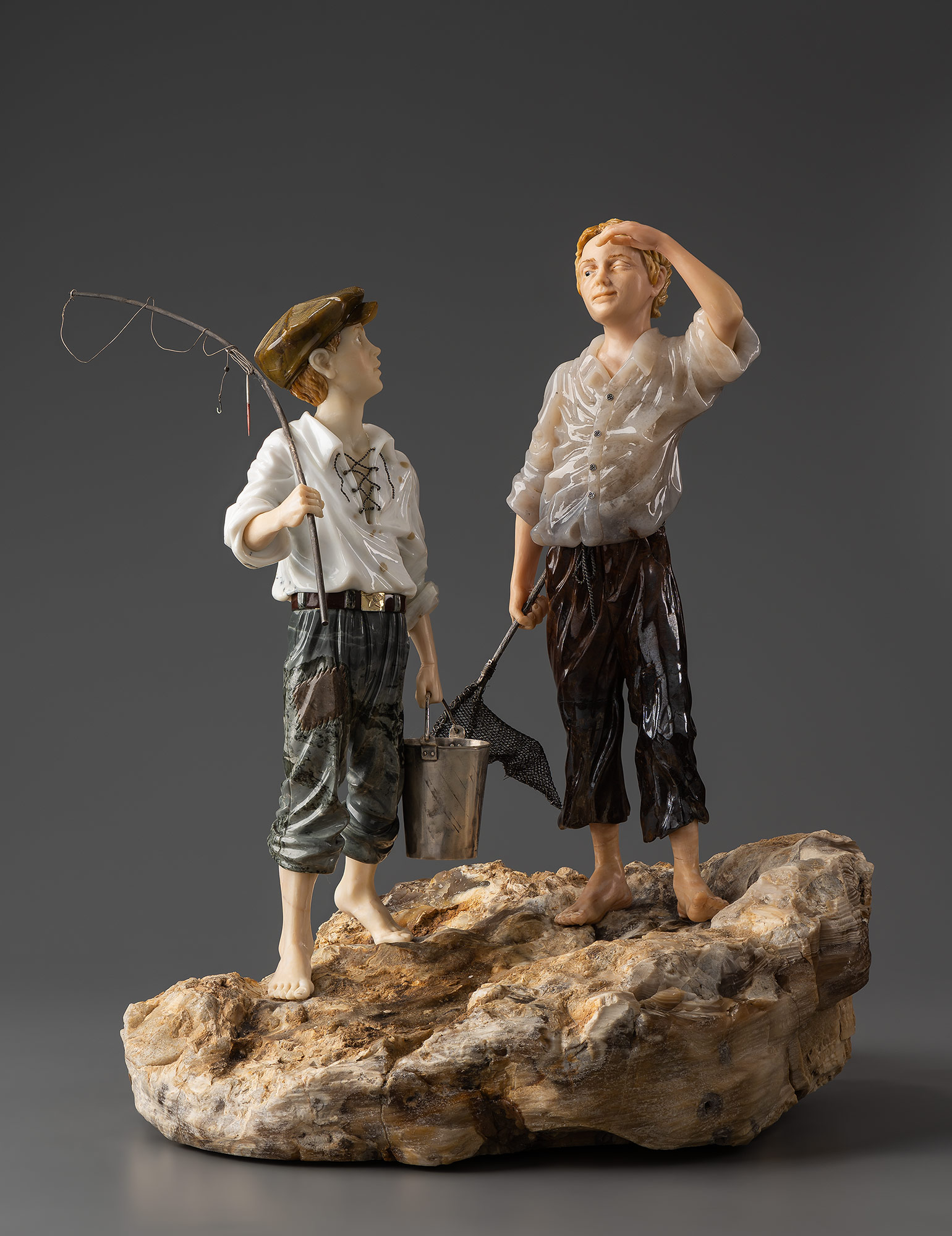 Рельефная серо-охристая подставка природной формы, вырезанная из цельного блока окаменелого дерева, представляет илистый берег реки, на котором разворачивается жанровая сценка. Два босоногих мальчика болтают о рыбалке. Деревенский житель держит ведро и удочку, он — местный, знает все рыбные места и готов показать их своему городскому другу.