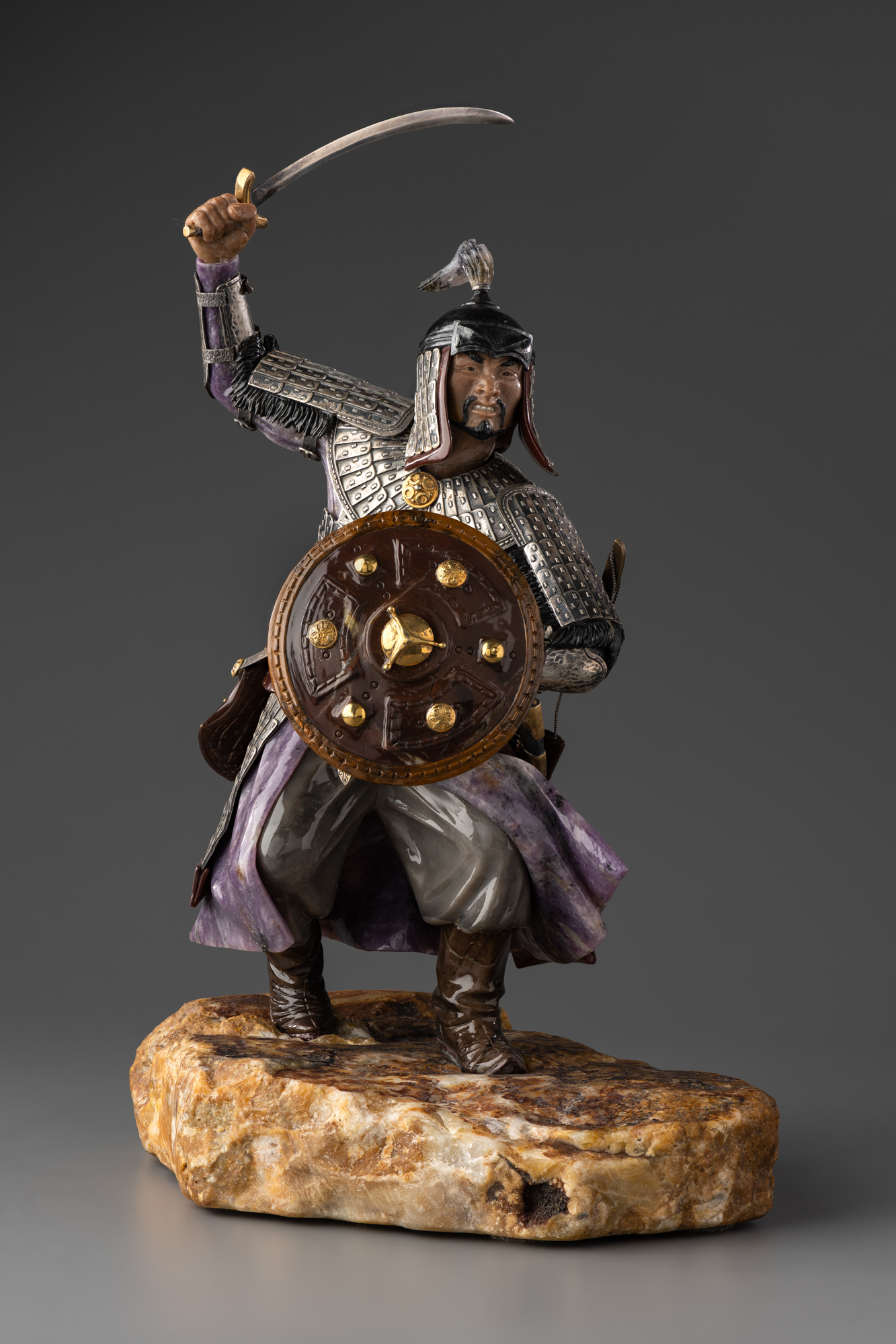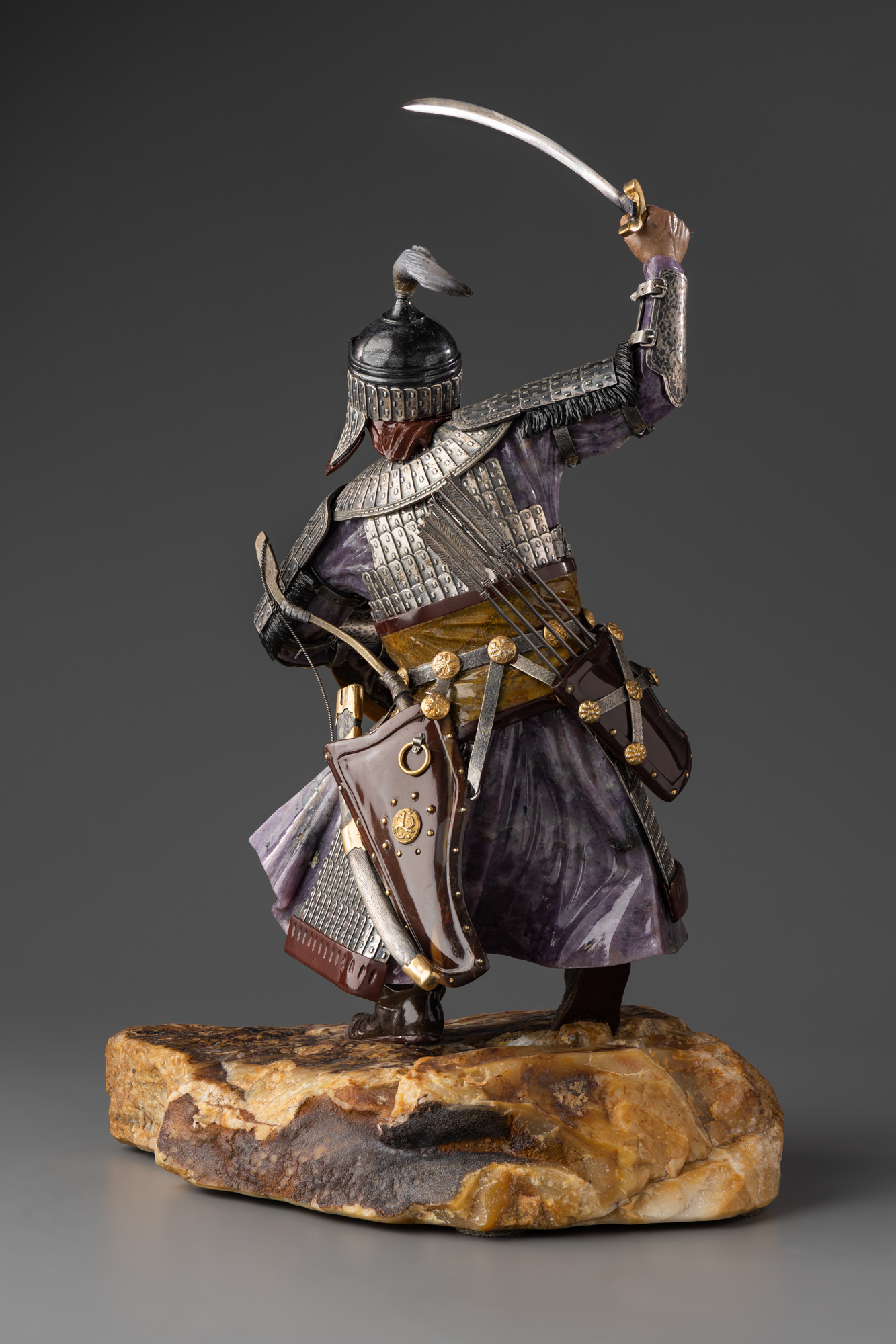 Халат воина высечен из чароита – одного из редчайших самоцветов, известных человечеству. Его фиолетовые переливы, перемежающиеся золотистыми и дымчатыми прожилками, словно олицетворяют степную даль, скрытую в тумане веков. Этот минерал, добыча которого строго лимитирована, год от года становится всё ценнее, что придаёт скульптуре не только художественную, но и инвестиционную значимость.