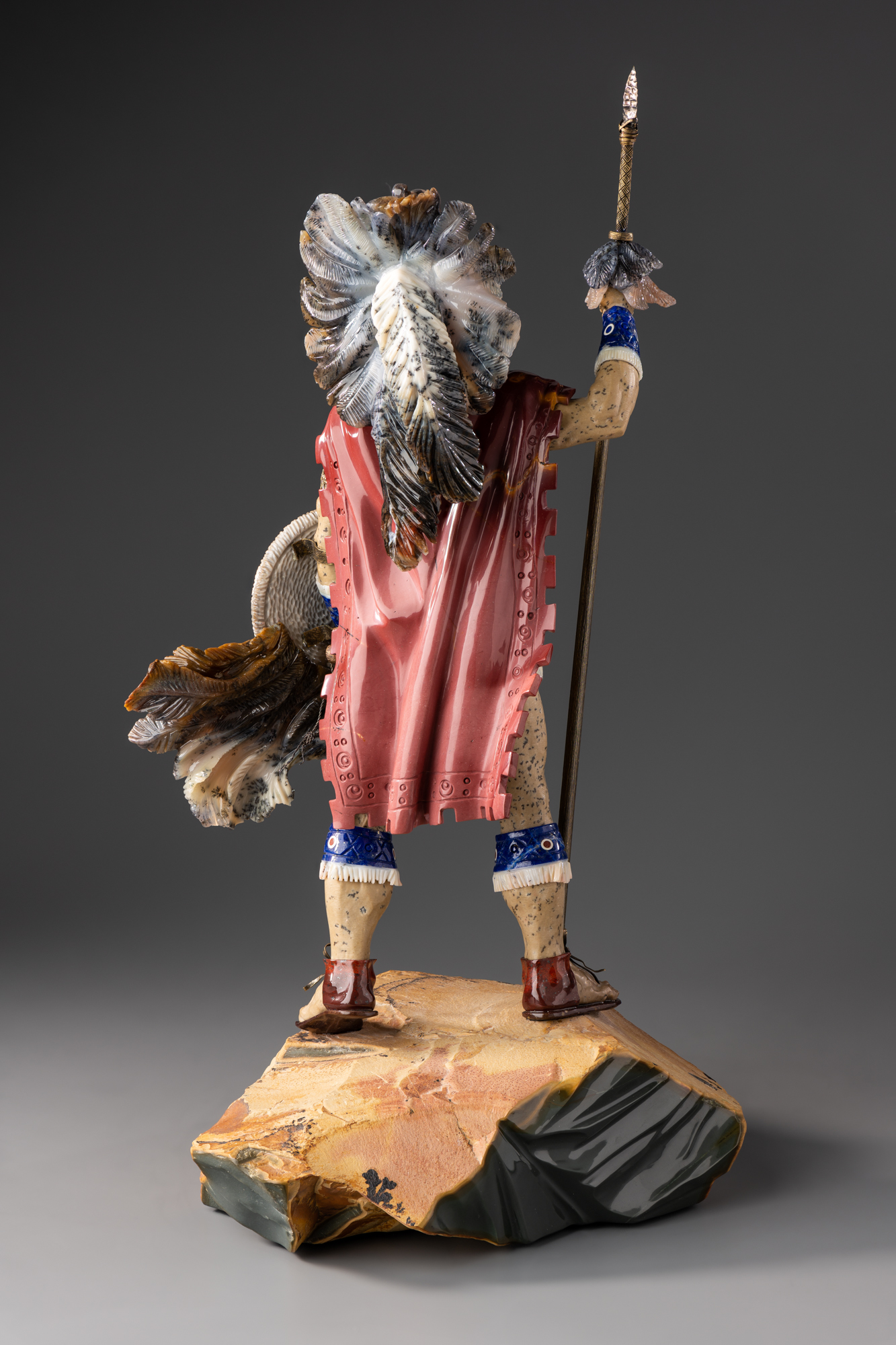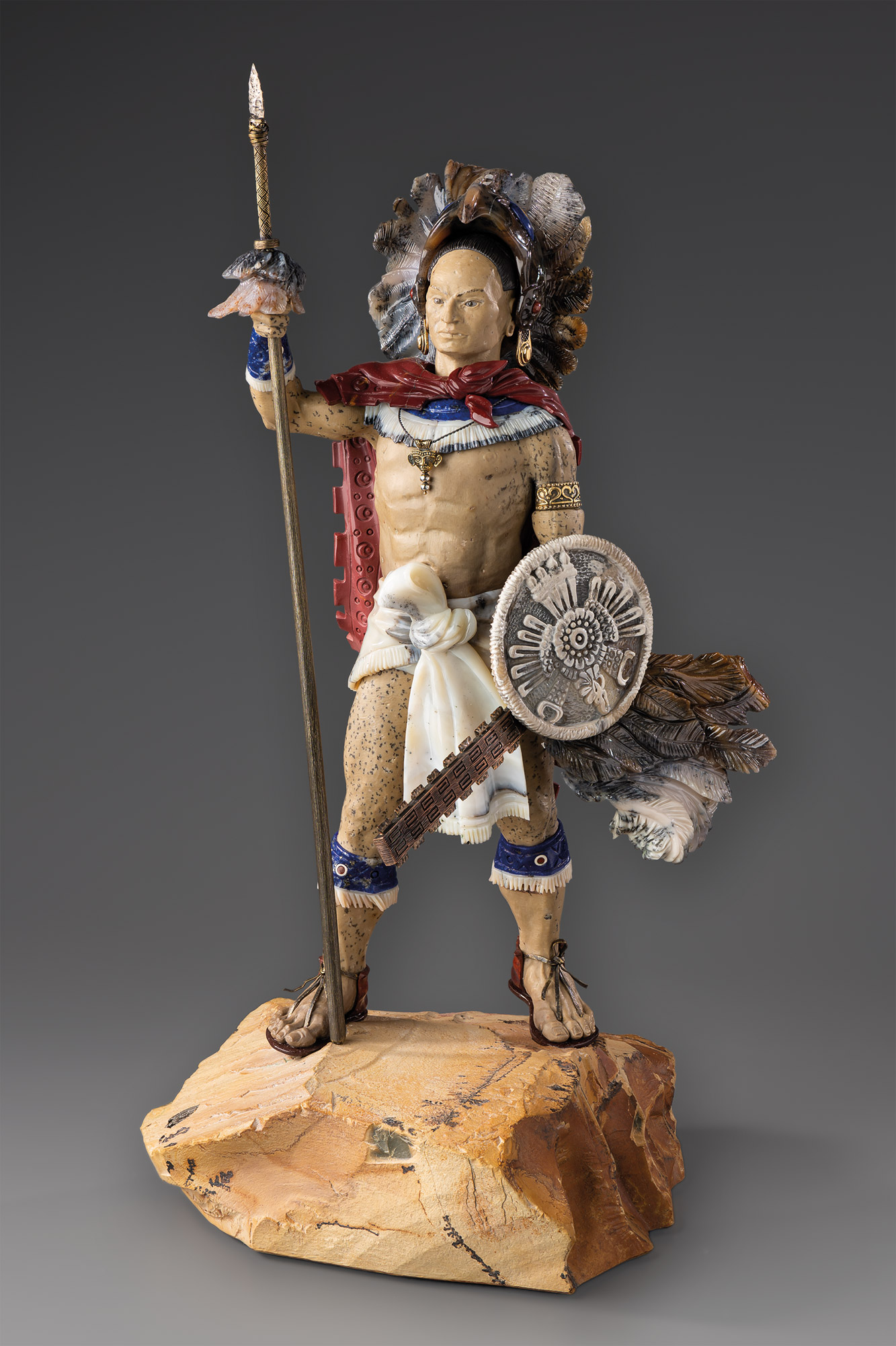 На частично обработанной монолитной подставке розовато-бежевых тонов — фигура стоящего анфас полуобнаженного смуглого мужчины в стилизованной одежде южноамериканского индейского воина: завязанной узлом бело-серой набедренной повязке, накидке и сандалиях красных тонов. Круглый воротник, повязки-манжеты на руках и ногах выполнены из синего, с мягкими белыми включениями камня и оформлены белой бахромой.