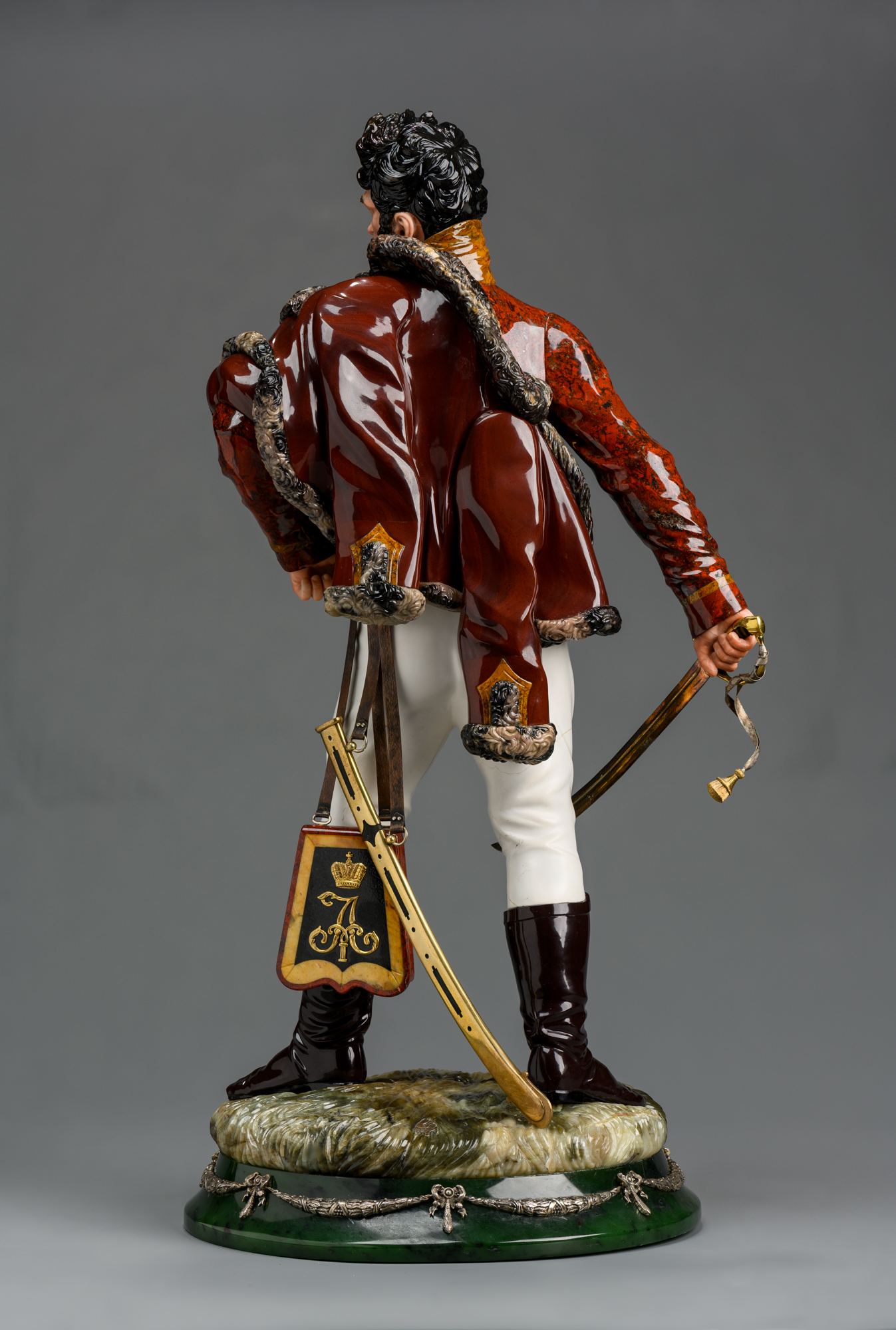 Одет в парадную гусарскую форму начала XIX века: темно-красную куртку «венгерку» с поперечными шнурами и накинутый на левое плечо темно-красный ментик с серой меховой опушкой, белые лосины и темно-коричневые сапоги с золотистыми кисточками.