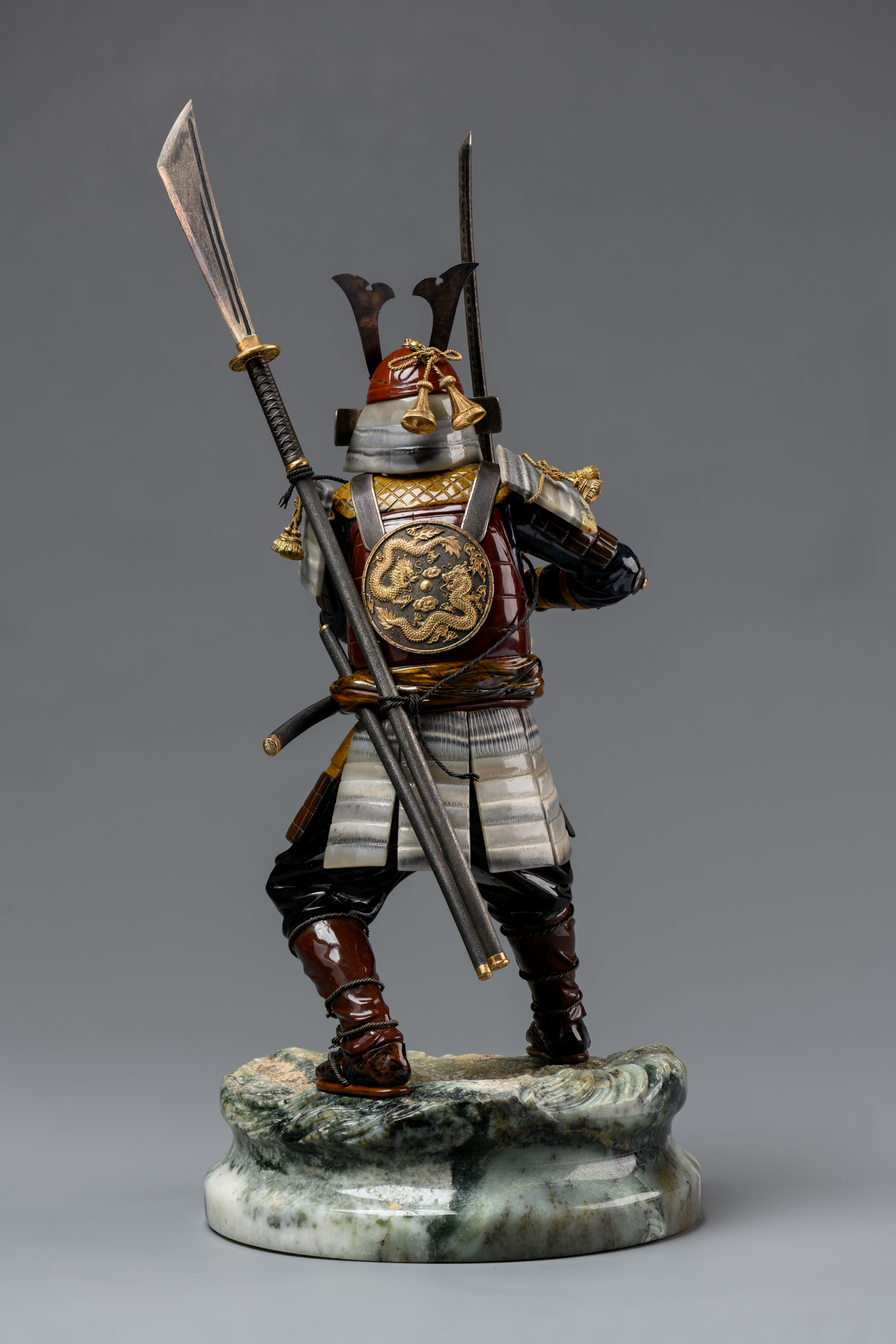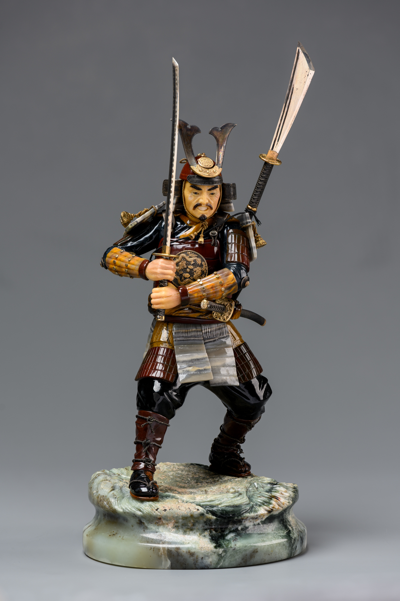 На круглой подставке из камня с бело-серым струйчатым рисунком — фигура стоящего в боевой позе, с упором на правую ногу, белозубого мужчины в костюме средневекового японского воина черных, коричневых и охристых тонов: рогатом шлеме, куртке и кожаном нагруднике, украшенном круглой металлической бляхой с изображением драконов, высоких сапогах со шнуровкой.