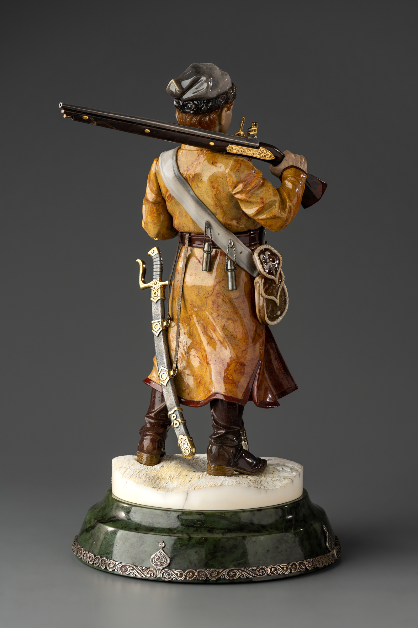 На круглой ступенчатой подставке темно-серых тонов с белой, обозначающей снег горизонтальной накладкой — фигура стоящего рыжебородого мужчины в форменной одежде русского военнослужащего допетровского времени: зимнем кафтане-кожухе из минерала с размытым рыже-коричневым рисунком и коричнево-бордовым фактурным подкладом, светло-серой шапке-мурмолке с темной опушкой, черных сапогах на каблуках.