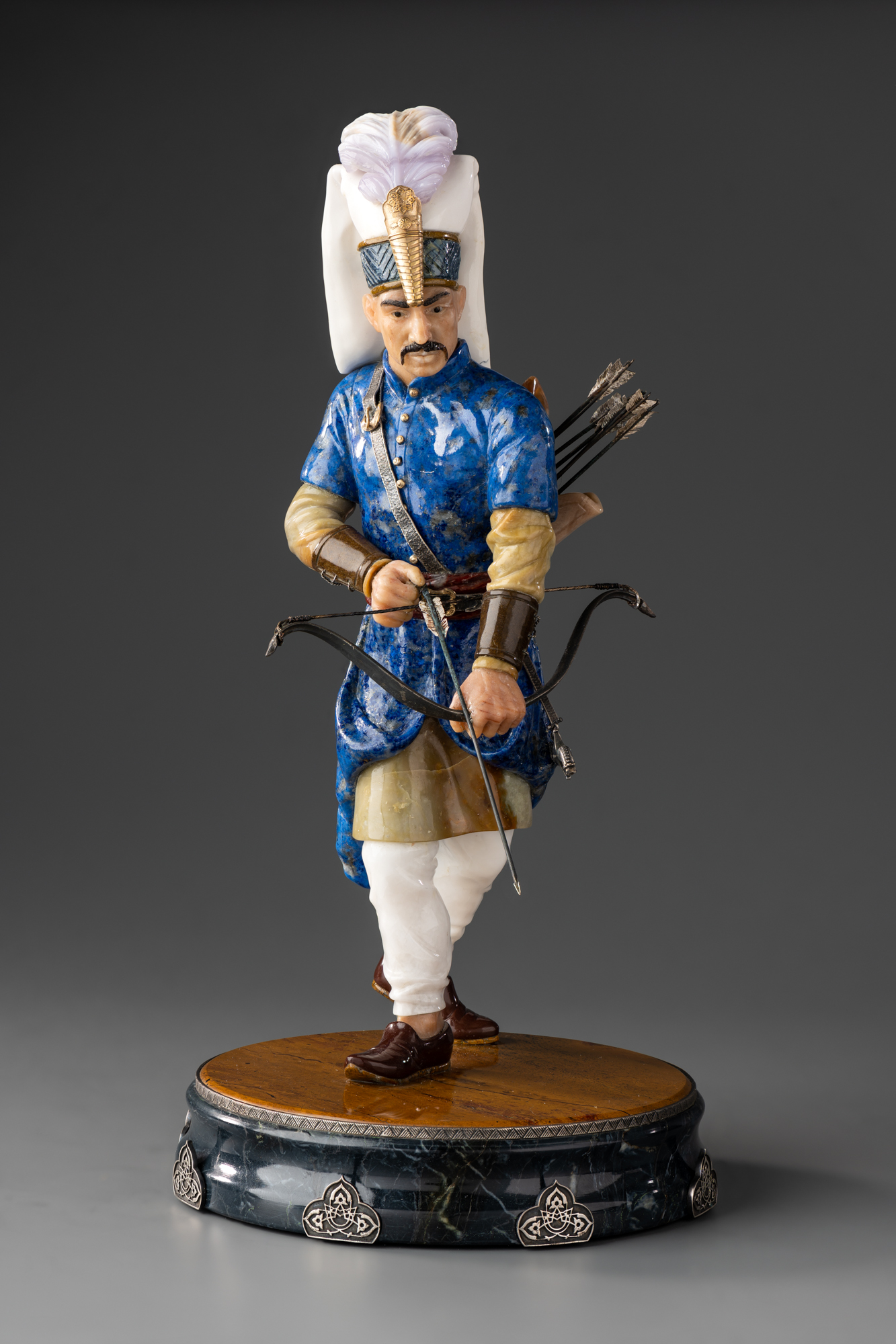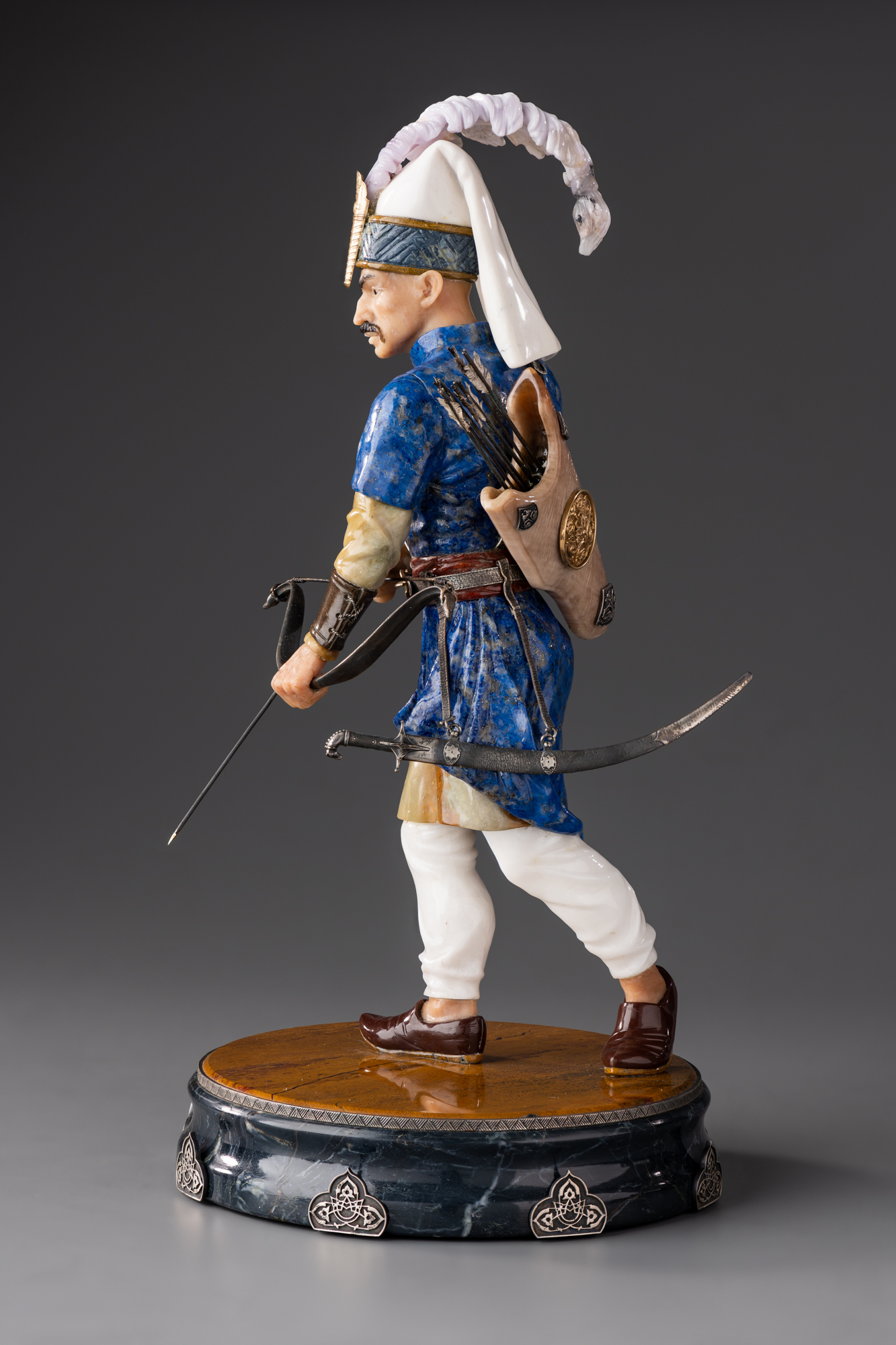 На круглой подставке из тёмно-серого со светлыми прожилками камня с накладным металлическим декором в виде мусульманских трилистников и с кофейно-коричневой верхней площадкой – фигура стоящего мужчины в стилизованном костюме турецкого воина: голубом халате с короткими рукавами и воротником-стойкой, длинной рубахе охристых тонов с тёмно-коричневыми кожаными наручами, белых штанах и надетых на босые ноги тёмно-коричневых туфлях с приподнятыми носами. На голове – высокий, с откинутой назад тканью белый убор с серо-голубой рельефной каймой внизу и украшением в виде пышного султана из светло-серого просвечивающего камня с орнаментированным наконечником из золотистого металла.