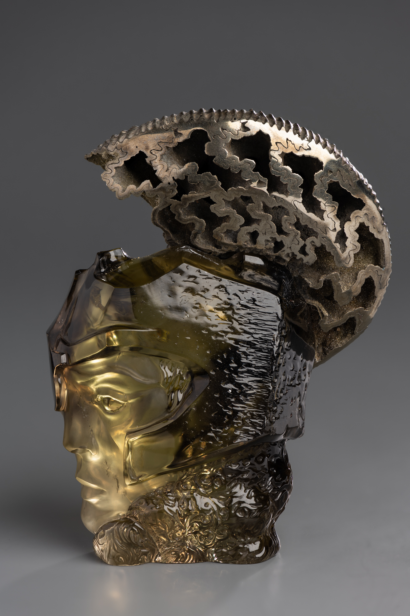 В скульптуре «Золотое руно» мастера Иван Голубев и Алексей Зефиров обращаются к популярному эпосу древнегреческой мифологии. Перед нами предстает голова античного героя, одного из участников легендарного мореплавания на корабле «Арго», возведенного с помощью богини Афины. Голова мужчины облачена в стилизованный древнегреческий шлем коринфского типа, который был распространен в период с VI по V вв. до н. э. Гребень шлема выполнен из окаменелого аммонита, раскрытые спиральные створки его раковины виртуозно вписаны авторами в общую композицию.