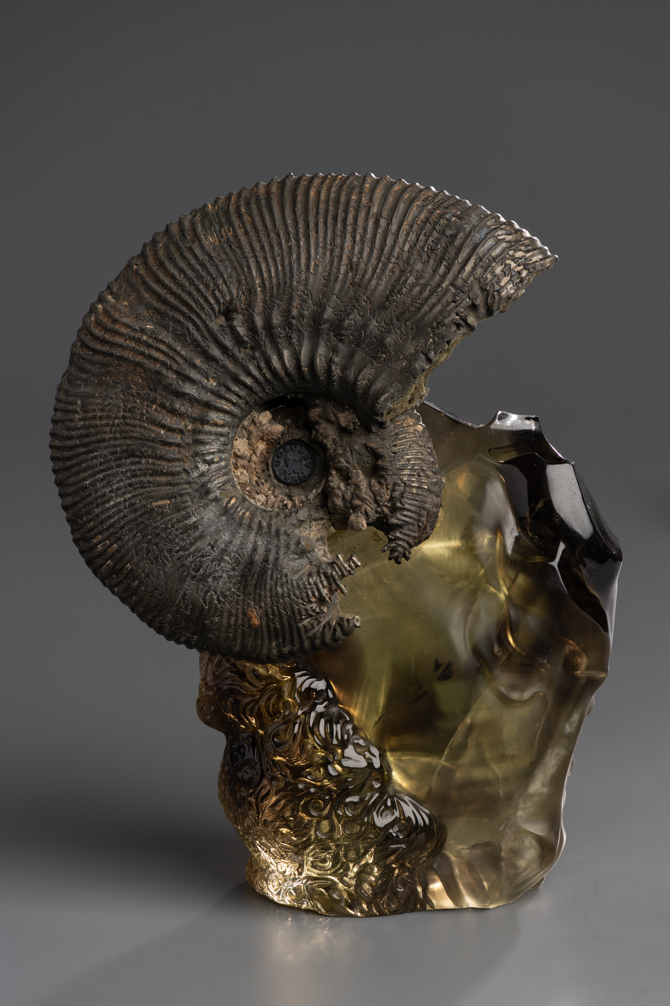 В углублении аммонита круглое металлическое клеймо автора: в центре изображение птицы, по окружности «GOLUBEV IVAN»